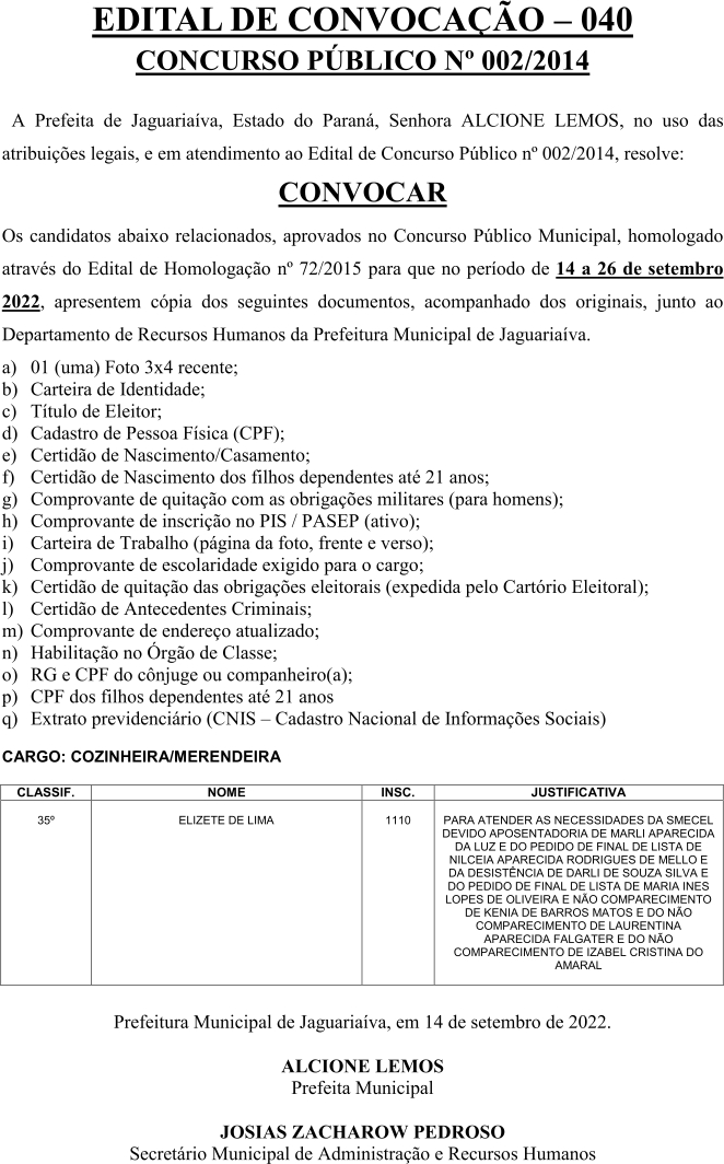 Edital de Convocação 040 – Concurso Público 002/2014
