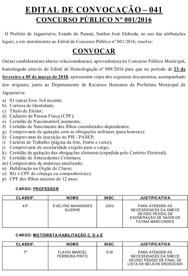 Edital de Convocação 041 – Concurso Público Nº 001/2016