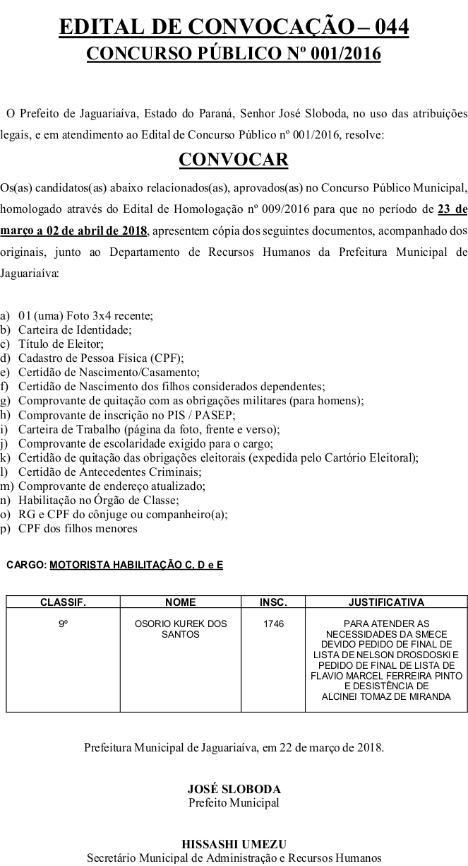 Edital de Convocação 044 – Concurso Público 001/2016