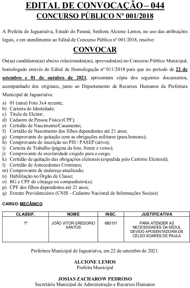 Edital de Convocação 044 – Concurso Público 001/2018