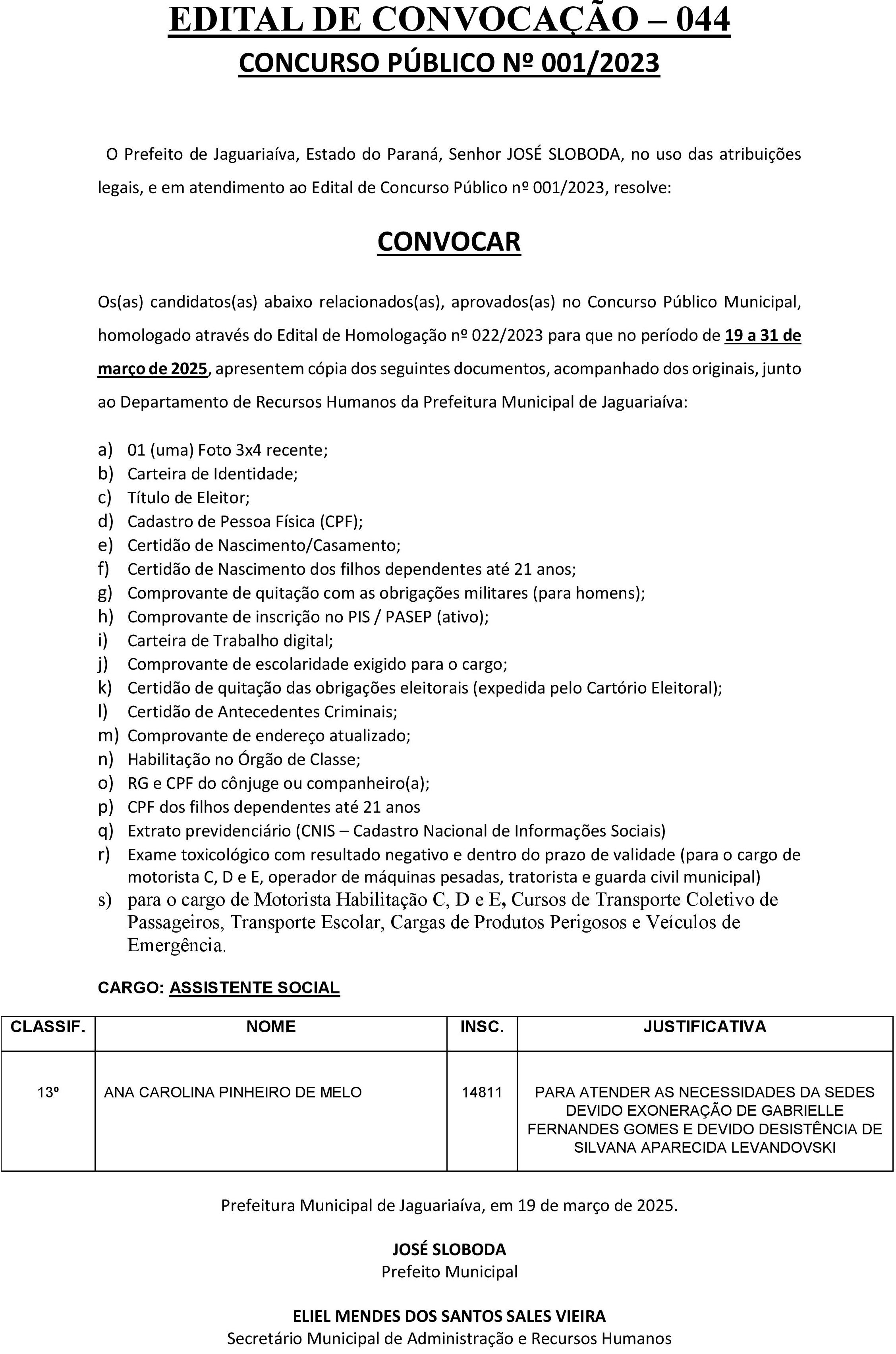 Edital de Convocação 044 – Concurso Público 001/2023