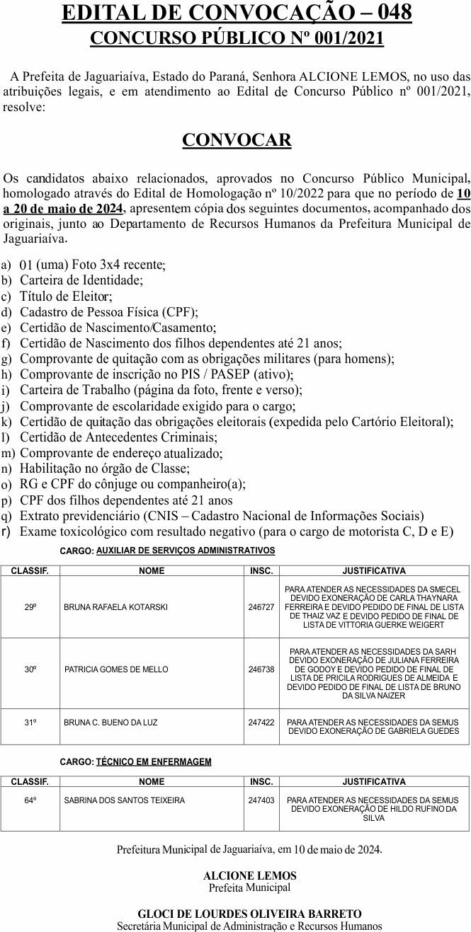 Edital de Convocação 048 – Concurso Público 001/2021