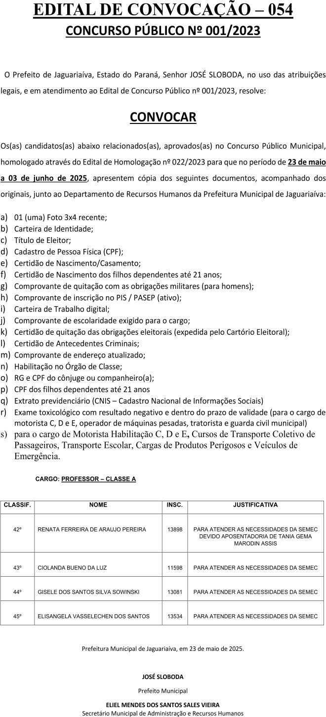 Edital de Convocação 054 – Concurso Público 001/2023
