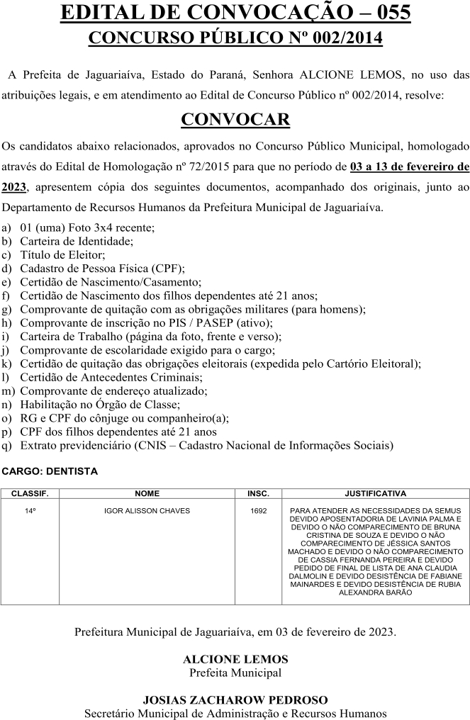 Edital de Convocação 055 – Concurso Público 002/2014