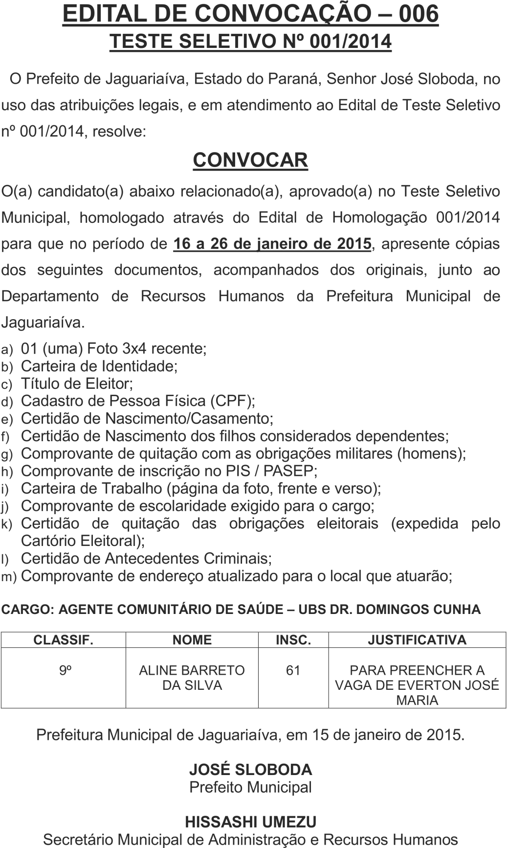 Edital de Convocação 06 – Teste Seletivo N° 001/2014