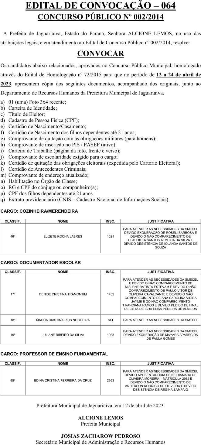Edital de Convocação 064 – Concurso Público 002/2014