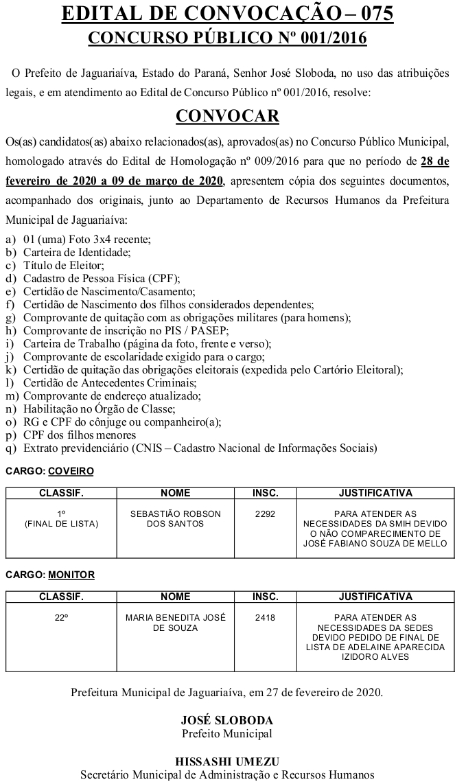 Edital de Convocação 075 – Concurso Público 001/2016