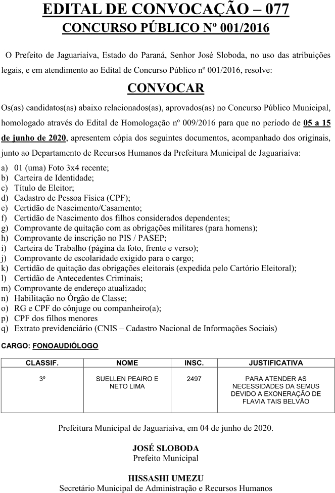 Edital de Convocação 077 – Concurso Público 001/2016