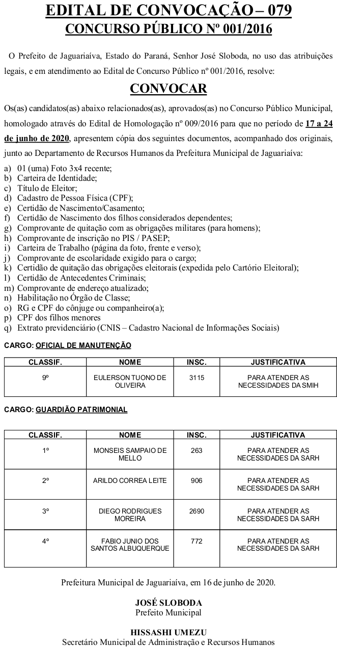 Edital de Convocação 079 – Concurso Público 001/2016