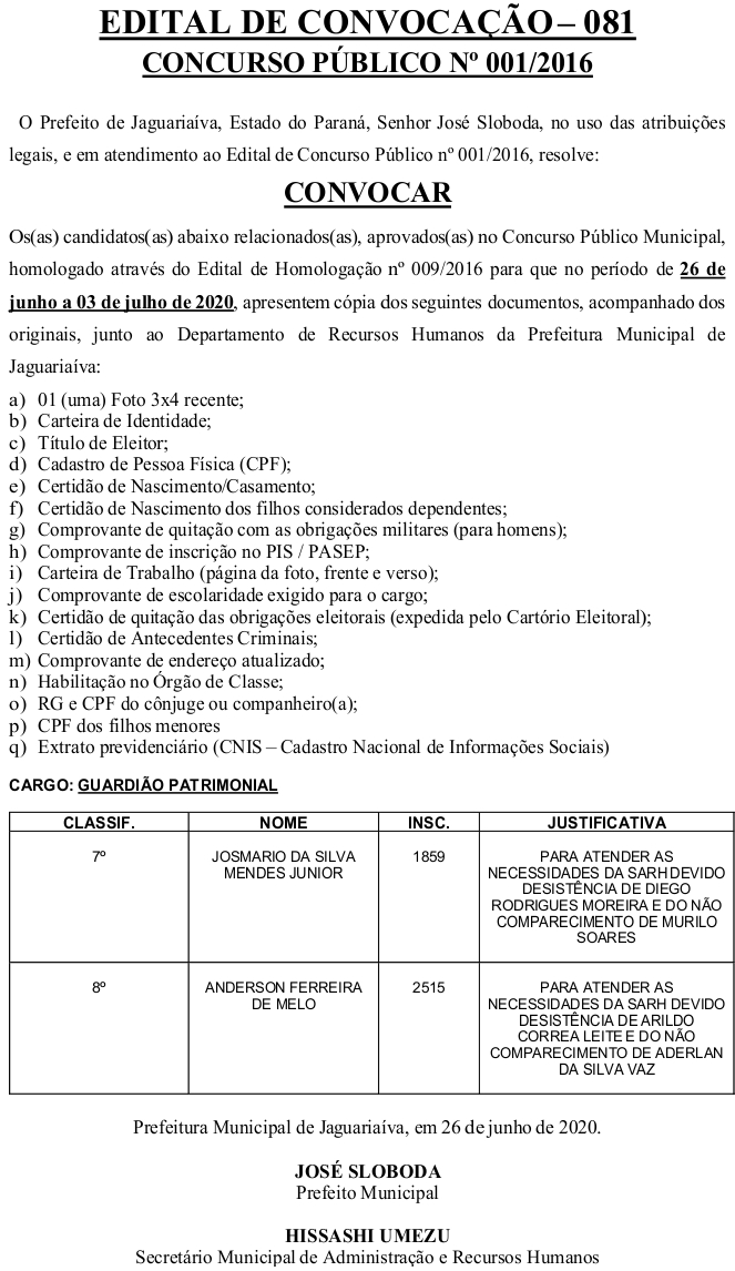 Edital de Convocação 081 – Concurso Público 001/2016