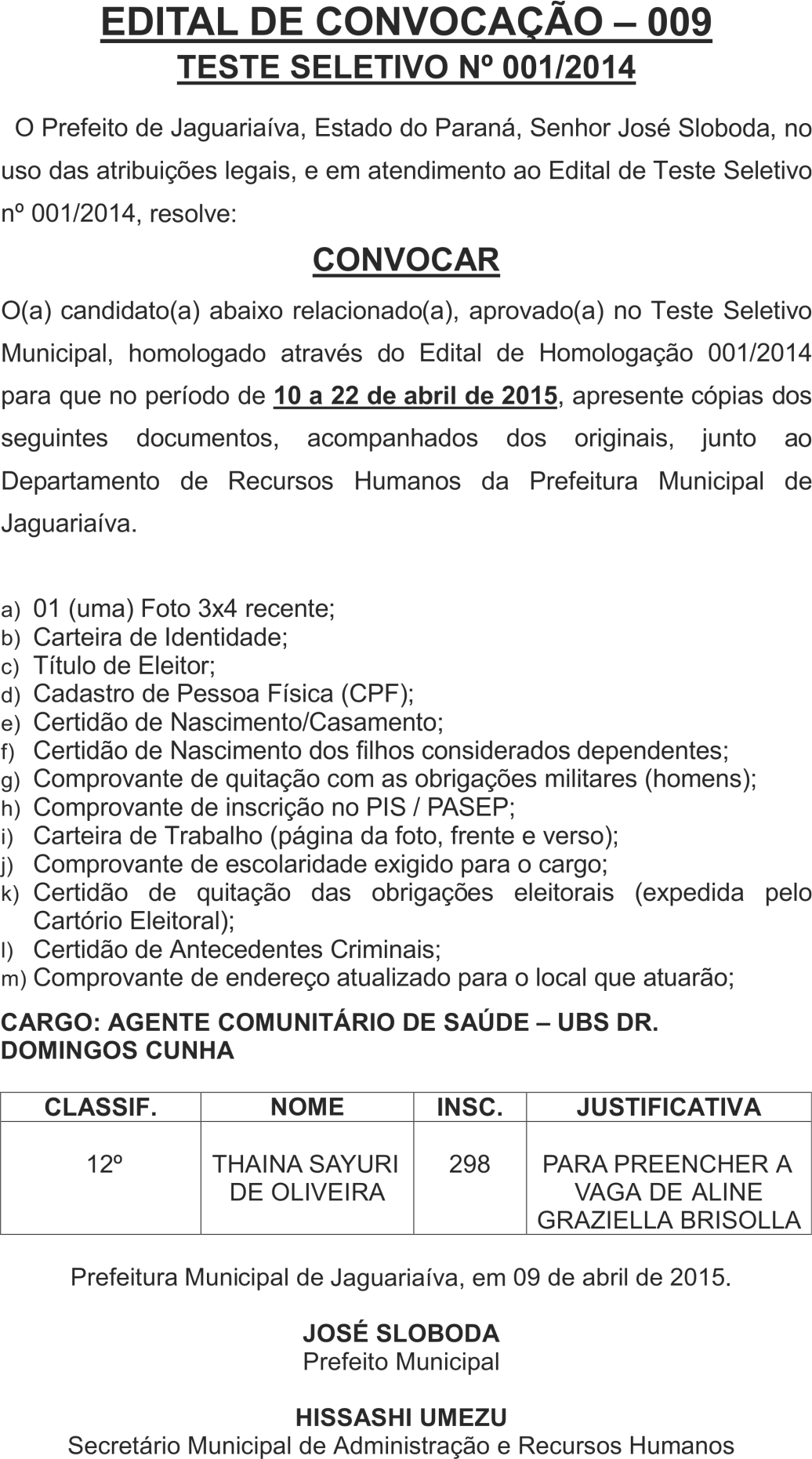 Edital de Convocação 09 – Teste Seletivo N° 001/2014