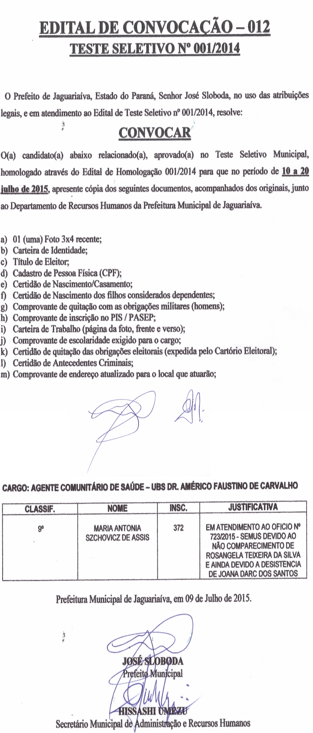 Edital de Convocação 12 – Teste Seletivo N° 001/2014