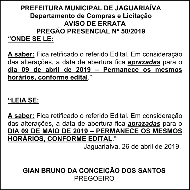 Errata Aviso de Licitação Pregão Presencial Nº 50/2019