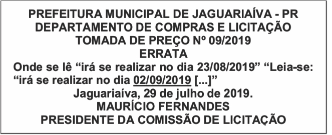 Errata Aviso de Licitação Tomada de Preço Nº 09/2019