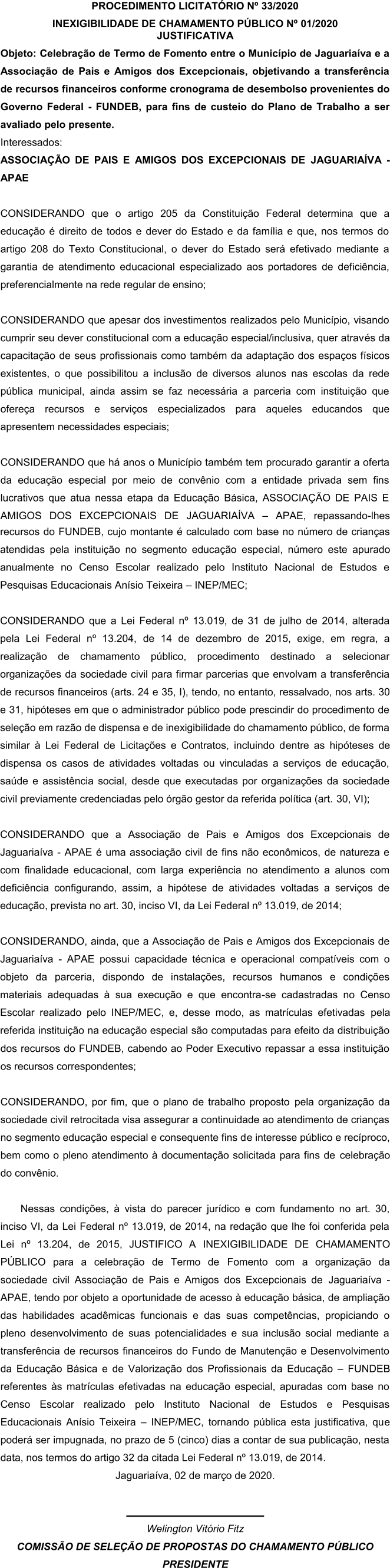 Justificativa da Inexigibilidade de Chamamento Público Nº 01/2020